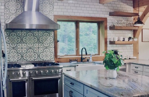 Go up the stairs and enter into a breathtaking great room with hardwood stove, and floor to ceiling windows. The perfect place to cuddle up by the fire on our soft leather couches and watch the snow fall or the leaves rustle in the wind during the fall. There is a custom 10' farm table allowing plenty of room for a nice large dinner surrounded by friends or family, a peninsula with benches looking into our custom cook's kitchen complete with 48" stove with double oven, stainless steel appliances and granite countertops. As you head towards the back of the main level there is a full bathroom with a tub/shower on the left. The master bedroom has 1 king bed, and 1 twin over full bunk bed. The master ensuite has a large stand up shower with frameless glass and double vanity. The other bedroom on the middle level has a twin bed and a twin over full bunk bed.