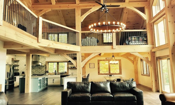 You will have our timber frame home all to yourself. Our home is 4,000 sq ft on 1 acre of property, with a large circular driveway with plenty of parking. Our home has 3 bedrooms and an office which is used as a bedroom, two which have added lofts in them, 3 full bathrooms, cooks kitchen with a 48" stove, 3 living spaces, 60" and 65" TV's, open floor plan, great room, game room (pool table/Foosball table) mud room and BBQ grill. There is a hot tub on back deck, and a new fire pit with Adirondack chairs!