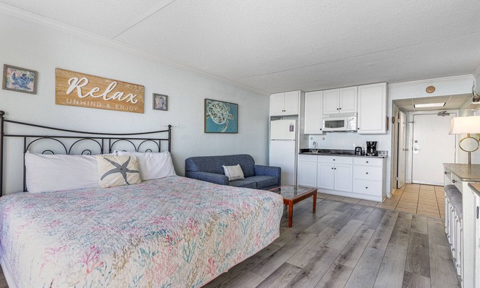 Condo 2231 is LOCATED DIRECT OCEAN FRONT on the 2ND FLOOR with AMAZING VIEWS OF THE BEACH AND OCEAN. Just open the sliding glass doors, sit on the BALCONY and relax to the comforting sounds of the beautiful sea. It will SLEEP 4 PEOPLE with a KING BED and sleeper sofa. This condo comes equipped with a small kitchen area which includes a 2 burner cooktop, full size refrigerator, microwave, coffee maker and any dinnerware you will need.