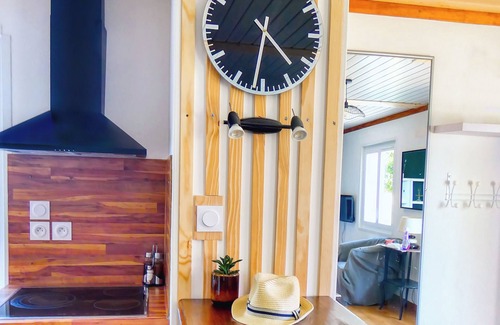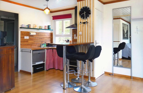 - A bright living room with lounge (140cm sofa bed, armchair, TV, wifi, fan), fully-equipped kitchen (ceramic hob, oven, fridge, freezer, dishwasher, microwave, coffee machine, kettle, toaster) and a dining area around a bar for 4 people.