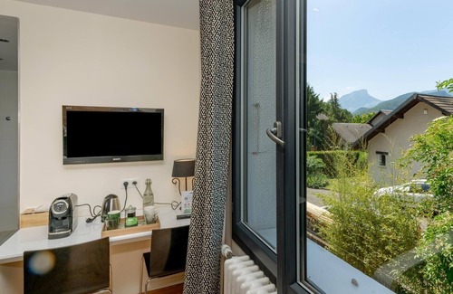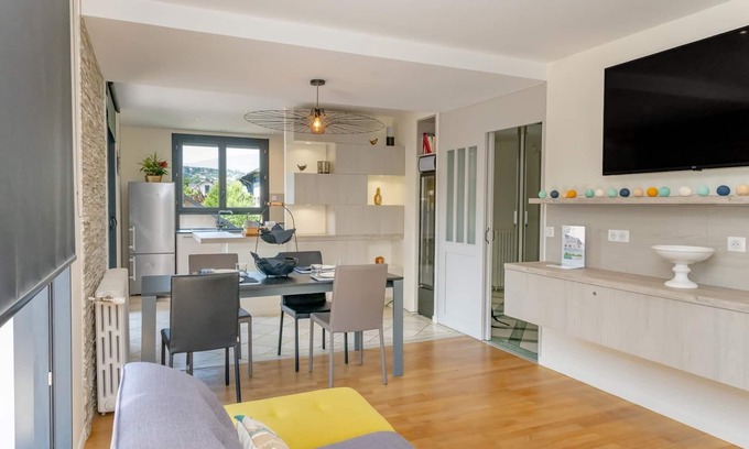 Apartment located on the 1st floor of a townhouse with 2 other accommodations including that of the owner. Living room with kitchen open to the living room. Pleasant, very bright living room with SmartTV, Chromcast and Canal+ channels. Access to the balcony-terrace. 2 bedrooms (1 bedroom with a double bed 160 x 200 cm / 1 bedroom with two single beds 90 x 200 cm which can be twinned into 1 double bed 180 x 200 cm) with shower room, separate WC, television, Bluetooth speaker and desk in each bedroom. Room for sports storage and provision of 4 bicycles including 2 with electrical assistance. Hydrotherapy spa, shared swimming pool, ping-pong table, pétanque court, outdoor sauna (barrel) with paid access (see terms and conditions with the owner). This spacious apartment has been carefully renovated to offer two remarkably comfortable bedrooms. Original features, such as the terrazzo floor, have been preserved to highlight the art deco style of the house. Whether for one night or an extended stay, the facilities and attentions carefully thought out by Alain and Pascal, the owners, ensure comfort and relaxation. Just 3 km from Chambéry and easily accessible, La Porte des Alpes is the perfect base camp for exploring the diverse attractions of Savoie or for recharging your batteries during business trips. On-site, special attention is paid to the garden, equipped with a spa and a boules court, as well as high-tech equipment to ensure optimal relaxation. Electric bikes are available to facilitate travel within the city. The three village resorts of Savoie Grand Revard offer an alpine and Nordic ski area that is very popular with families and sports enthusiasts.