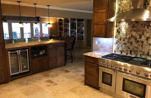 The house also boasts 3 living/gathering areas with a pool table and foos ball table, a large kitchen with commercial grade luxury appliances, a separate wet bar/full refrigerator, and 2 extra large patio areas directly on the lake and off of the main living area. There is a large boat dock with electric lift. This fabulous home is located within walking distance from many restaurants and is just a 5-10 minute drive from most places in town! We offer free high speed WIFI and Uverse cable, with flat panel televisions in all rooms. This home is ideal for a disabled or elderly individual with majority of the living space on one level. There are 4 icemakers, 3 heat/air units, 2 water heaters, 3 indoor dining areas, 1 outdoor dining area, high capacity front loading washer and dryer, and 4 1/2 bathrooms making this home not only comfortable to sleep in but also very comfortable to actually live in during your stay!