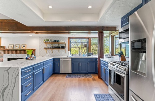 Gather all of your family and friends around this gourmet eat-in kitchen, fully stocked, stainless steel appliances, quartz countertops, a 5 burner gas range, and a large oven. Fireplace in the eat-in kitchen area. Unobstructed views of the lake!