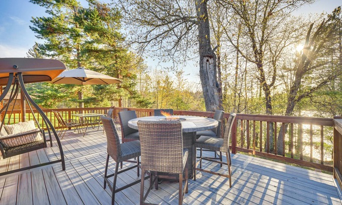 Outdoor adventure awaits at this Danbury vacation rental! With a beautiful waterfront setting, an expansive lake-facing deck, and a cozy interior, this 3-bed, 2-bath cabin is perfect for a peaceful stay within nature. Boat and fish on Tabor Lake, check out nearby wineries and golf courses, try your luck at St. Croix Casino, and visit the stunning Amnicon Falls! Then, return home to stargaze by the fire.