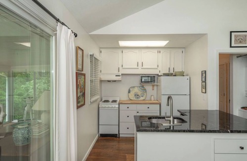 A charming two-bedroom home with ensuite baths, full kitchen, generous living and dining space, gas-log fireplace, and a sun porch with lake views.