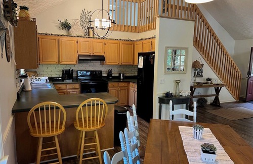 Inside on the main level you will find an open area combining a super comfortable sitting area with room for the whole family, and the dining area, with seating for six at the table, along with two bar stools at the breakfast bar. In the kitchen, you'll have everything you need, with a coffee pot, microwave, stove, and dishwasher. The side-by-side fridge makes ice quickly to keep your drinks cool on those hot days out at the lake.