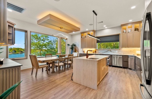 This home’s kitchen stands as a culinary centerpiece, featuring top-tier appliances set within a layout crafted for conviviality. The large island doubles as a prep space and an inviting hub for casual meals, with its elegant countertop set against the backdrop of soft-hued cabinetry. Task lighting beneath the cabinets illuminates a detailed backsplash, enhancing the luxe feel. Artistic lighting above melds utility with design flair. Adjacent lies the dining area, encircled by broad windows that frame the tranquil outdoors, ensuring every meal is accompanied by a picturesque backdrop. Crafted for both daily fare and festive gatherings, this kitchen is a haven of gourmet elegance.