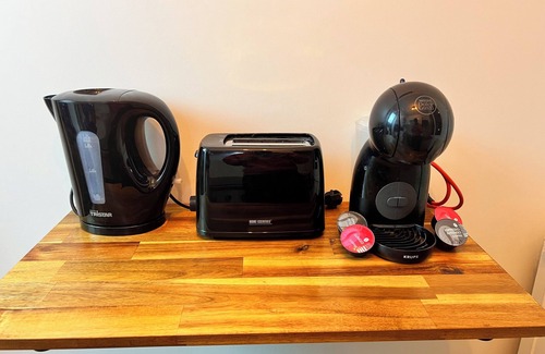 The kitchen is equipped with an oven, a stovetop, and a refrigerator, as well as a coffee maker, an electric kettle, and a microwave. Bathroom amenities include a hair dryer, towels, and toilet paper. And there's access to laundry facilities, so you can even pack a bit lighter. Other amenities include bed sheets, an ironing board, and heating.