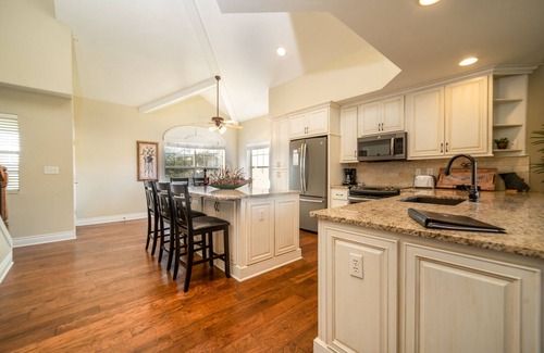 While you're here, you can enjoy all the comforts of home and more, including a jetted bathtub and a seasonal outdoor pool, as well as a full-sized refrigerator/freezer and an oven. Other amenities include premium bedding, towels, a DVD player, and kitchenware and utensils.