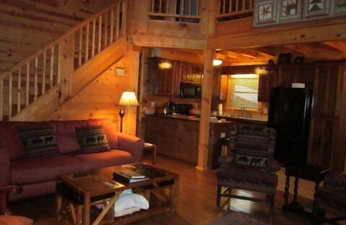 The cabin will accommodate 3 couples or singles, each with their own bedroom and bath, one on the main floor, one upstairs and one in the basement game room. The loft contains a twin size/twin trundle day bed that offers an open view down to the livingroom and stacked rock fireplace.