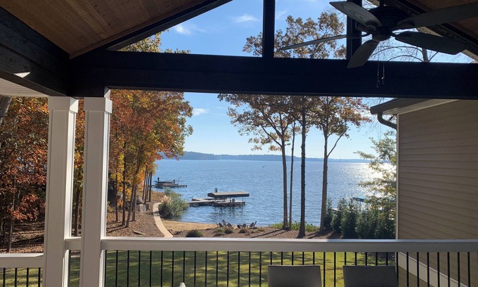 Absolutely fantastic lake home with big water views. Deep water dock perfect for swimming, fishing and boating. Sandy beach with shallow water great for children. Fully renovated home with two separate living areas. Upstairs living has large open kitchen with views to lake, smart TV and plenty of space to gather. Four large bedrooms and three baths without any steps. On the stepless main level there are two master suites with king size beds and adjoining baths. Queen bedroom with bunk beds and an additional bedroom with queen size bed. Large deck and covered porch with beautiful lake views. Nothing better than mornings on the porch! On the terrace level there is another king bedroom and private bath. Game room with Smart TV, pool table and lake views. Three total en-suite bedrooms all with king beds. Large level yard for backyard games and an outdoor gas grill for cooking out. Concrete walkway to lakeside dock with umbrella, table and chairs. Lakeside fire pit for evening fun. 4 kayaks and one standup paddleboard. House is located at the peaceful south end of the lake.