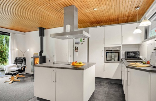 This well-equipped vacation home is situated on a beautiful natural plot surrounded by trees. The bright interior makes a well-kept, warm impression. Take advantage of the many windows in the living room, which let in plenty of light even on cloudy days. Enjoy your vacation meals with a view of the greenery and relax in front of the wood-burning stove in the evening.