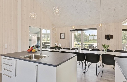 This beautiful 18-person vacation home contains 7 bedrooms divided between two sections of the house. Four sleeping accommodations are located on the sleeping loft. There are three bathrooms, a large kitchen and a bright living room. Also game room with billiards, table tennis, darts and Wii is offered to you. At the bar you can prepare drinks. That's not all. In the area with the swimming pool you will also be pampered by whirlpool and sauna. The house is located in a new area close to Hostrup beach. The child-friendly Limfjord is just a few minutes walk and at the end of a path. At the end of the path is also a common playground, children can get there without having to worry about traffic. A few kilometers from the house there is a nature playground. The cottage is surrounded by nature and is not far from Skive and Holstebro, where you can enjoy shopping and dining.