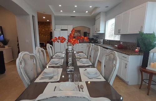 Welcome to our California Vacation Home! The 6 bedroom/6 bath (private rooms)sleeping accommodation for 15 people makes this a great vacation home for multiple families. This Vacation Home is larger than most others in the area.Luxurious, elegant, and spacious with an open Living room with 60"Tv and (4more tv in the rooms)Dining Room with table/6 chairs, Family Room with fireplace, Large Kitchen fully functions and well stock with everything you need (refrigerator with water filter and ice maker, coffee maker, microwave, blender,Dishwasher and another table/6 chairs.Multiple rooms open onto a large covered Patio, with longing , fire pit and 65 jets Hot Tub with 6 seats for your family and friends to enjoy ,you can also see the firework from Disneyland during the night timeI from the backyard. Next to the patio it's a Game Room with pool table and Foosball offer plenty of space for everyone to spread out. Rooms configuration: room #1 Cal.King bed,room#2 Queen bed,room #3, 2 Twin beds,room#4, Queen bed,room#5 Queen bed,room#6 a large kid's
