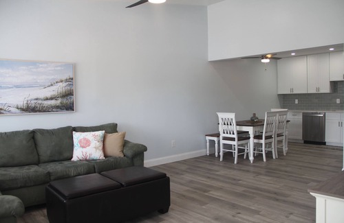 Newly renovated Village Green quad with open floor plan. Every room has been updated with new flooring, fresh paint and amenities. Covered front porch with seating and ceiling fan. Outdoor eating area with picnic table and grill, as well as an outdoor shower. Access to large outdoor closet for your personal use. When you enter the house, you are welcomed by cathedral ceilings and a open living room/kitchen area. The living room includes a large sectional sofa, that doubles as a queen size sleeper, and a large flat screen TV. The kitchen has been completely remodeled with new cabinets, stainless steel appliances and quartz counter tops. The first bedroom has a queen size bed and full bath. The second bedroom includes two full size beds. There is a newly renovated hall bath and brand new washer and dryer. We can recommend a service for towels and linens as we do not provide them. All towels and linens are provided by the renter. The Lobster House, Lucky Bones, C-View Inn, Wawa and the scenic harbor, as well as the Fishermen's Memorial are all within walking distance.