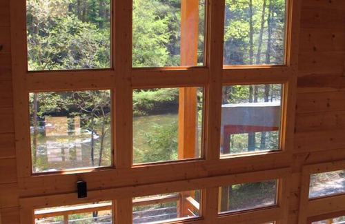 Rivermac is a luxury river cabin overlooking gentle rapids on the Toccoa River, across from the Chattahoochee National Forest.