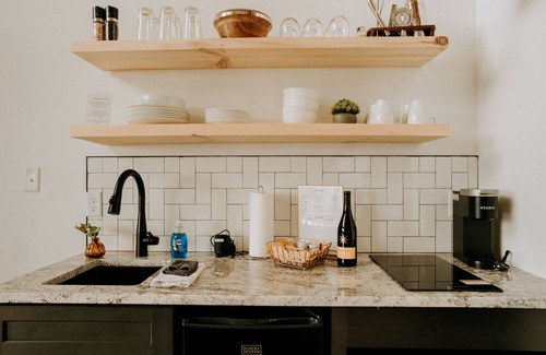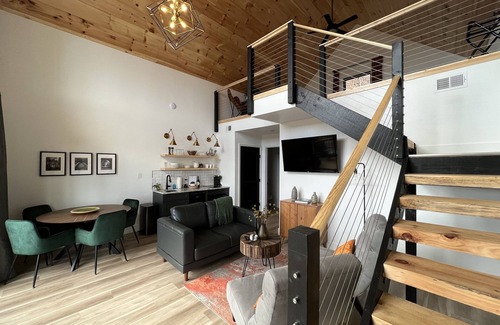 This modern cottage located on 6 sprawling acres is one of six located on Bluff Mountain across from the Trillium Wedding Venue. Nestled in the woods each cottage has a kitchenette, dining table with seating for four, love seat and two chairs. The large sliding glass doors at the front allow guests to immerse themselves in the relaxing woodland setting. The master bedroom features a king sized bed. Extra sleeping space is provided by two queen sized beds in the loft. The loft has a view through the large windows at the front of the cottage. A large shower and double sink vanity round out the amenities of the cottage. Our outdoor space features a deck with two adirondack chairs to enjoy your morning coffee while watching the beautiful morning sunrise. In the evening, you can enjoy our common area fire pit with a glass of wine while watching the lights of the city below.
