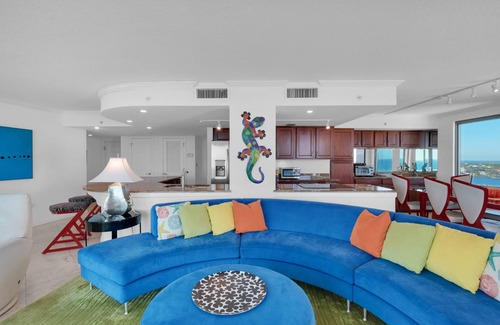 Escape to your private oasis at this stunning penthouse in Perdido Key, Florida, offering panoramic views of the Gulf Coast and Old River. With a colorful, fun beach aesthetic, this spacious 3-bedroom, 3-bathroom retreat sleeps 6 and is designed for ultimate relaxation and comfort.