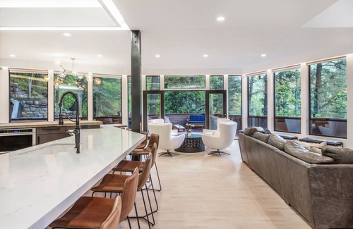 The spacious 4 bedroom Modern Treehouse offers all the comforts and private setting for your group of explorers. The open living room and kitchen offer floor to ceiling windows with forest views. Add the skylights and atrium, and it brings the outdoors in while you relax in front of the wood-burning fireplace.
