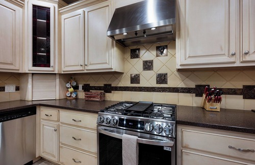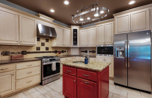 The rich, hardwood dining table is well-made and sturdy, and ready to accommodate up to 8 friends or family members when it’s time to sit down and break bread with one another. The fully equipped kitchen epitomizes lavish living, with granite countertops, stainless steel appliances and a breakfast bar with seating for 2.