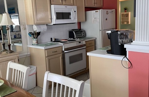 This unit newly remodeled 11/1/2020 comes with a fully equipped kitchen with dishwasher, microwave, Keurig single & 12 cup coffee maker, toaster oven, Washer and dryer in the unit. There are three tv's, a DVD player. High speed internet service. The covered patio overlooks the pool area.