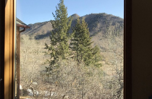 You can exit the house from four different areas....all leading to either a raised deck or private flagstone patio. There is nice patio furniture to enjoy the outdoors, gas grill (you provide the propane) fire pit and a very private setting for you to relax and enjoy the Rocky Mtns. There is parking for two cars down in our driveway which is on the street and to get to the house you walk up a long set of Flagstone steps (see photos). We are not handicap accessible at this point. The house sits on 2 acres so you have lots of privacy and will truly feel like you've escaped to the mountains! We also have wildlife at times, including a family of deer, lots of birds, possibly a fox sighting. Our house sits on the side of Pikes Peak and the temperature is generally 10° cooler than Colorado Springs during the summer. Most houses in our area do not have air-conditioning because it is just not needed due to the lower temperatures. We also have lots of windows and doors that you can open to get a cross breeze and three ceiling fans.