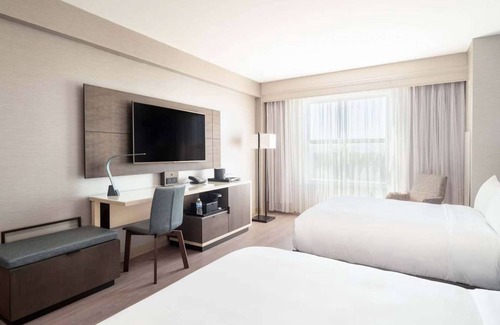 Relax in this beautifully renovated retreat featuring coastal-inspired design and two plush Queen beds fitted with pillowtop mattresses, custom duvets, and down comforters. Accommodating up to four guests, it is the perfect setup for families or small groups. Enjoy thoughtful in-room perks like a mini-refrigerator, a coffee/tea maker, and a dedicated workspace. Unwind with premium channels on the 37-inch flat-screen TV, or refresh in the private en-suite bathroom equipped with complimentary toiletries and a hairdryer.