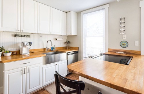 Our property is conveniently located at the crossroads of Cape Charles - an easy walk to "downtown", the beach, and across the street from Central Park. The duplex has a covered porch to enjoy your coffee in the morning overlooking the park and a back deck with table/chairs, umbrella and new gas grill, overlooking the fenced-in back yard with outdoor shower. The kitchen is newly equipped with upscale dishes and serving pieces if you like to entertain, Keurig coffee maker, electric and stovetop teapots. The kitchen also has a high chair, or youth chair if the tray is removed, plus children's dishes are provided.