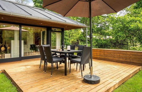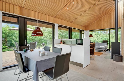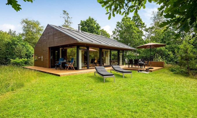 Modern cottage with interssanter architecture in the Fuglslev area, a cottage and nature area that offers tranquility and thanks to its central location allows trips to all the attractions in the area. The house is nicely and modernly furnished and has a good kitchen and bathroom. Spend a wonderful time outdoors on the beautiful terraces. Natural plot with lawn and trees and plenty of space. Approx. 10 minutes drive from Ebeltoft and the beach.