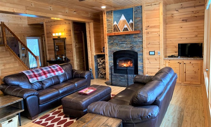 The home sleeps up to 10 adults comfortably, and is comprised of 3 bedrooms + a loft with a futon, 2 ½ bathrooms, an open main living area, a spacious modern kitchen, 2 wood-burning fireplaces, a rec room, and a den. The exterior of the home consists of two outdoor living areas including a covered porch accessible from the main level dining area and a large open deck with a nearby fire pit that is located just off of the lower level.