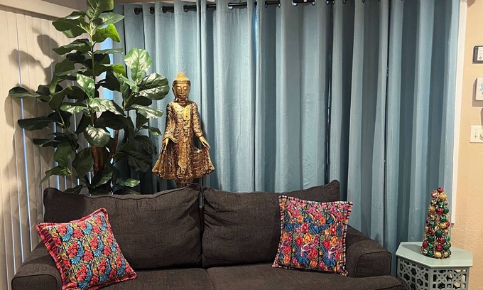 Small cozy apartment with sitting area and bedroom area, private bath, walk in closet space for clothes and washer, dryer, coffee maker, small fridge and microwave. Wifi internet, TV (Roku, Netflix, Pandora) sound machine. Towels, body wash, shampoo/conditioner and hair dryer. Bottled water provided.