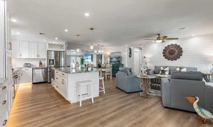 This updated home boasts all of the modern creature comforts, with over 2,000 square feet to indulge in intimate time together. Lounge in the cozy furnishings with a TV and dine together at the dining table or kitchen island. Every conceivable amenity is at your fingertips in the gorgeous kitchen, promising culinary creations sure to delight the gang. If you need to plug into reality for a few minutes, settle down at the desk nook that offers full-speed internet and a quiet setting. For your convenience, there is a full-size washer/dryer space. This home offers a live streaming service for your tv enjoyment.