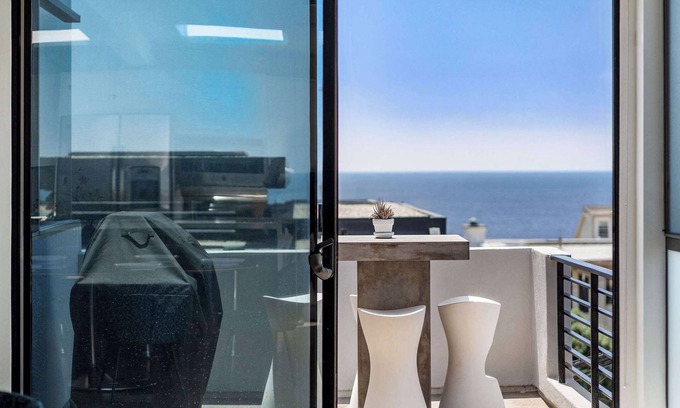 Enjoy panoramic views of the ocean from the comfort of your private balcony with comfortable seating situated just a block from the beach and two blocks from the bustling heart of downtown Manhattan Beach.