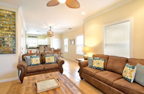 Enjoy high ceilings and tranquil decor in this beautifully decorated home, complete with tasteful, rustic-nautical furnishings that will have you feeling immediately relaxed as you step through the front door! Feast your eyes on the gorgeous large bucolic wood dining table and an open kitchen with beautiful granite countertops. The well-lit kitchen, with two breakfast bar stools, includes an abundant selection of supplies and appliances that make it perfect for entertaining loved ones with your culinary skills. The plush and cozy living room lures you in with cool tile and natural light from large windows, inviting you to surrender your cares and enjoy the large flat screen TV. Enjoy a gas grill to prepare your fresh catch of the day!