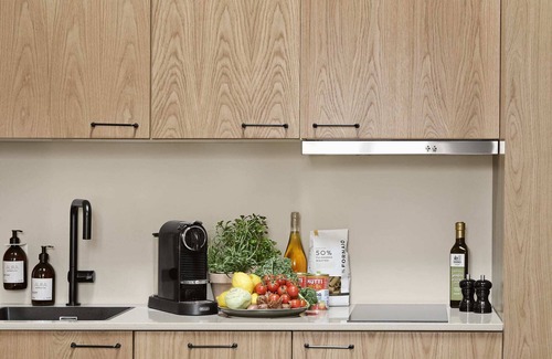 We are Aura, an apartment hotel in the center of Aarhus, located on Nørre Allé. Working closely with Danish architects and designers, we’ve shaped the building as a modern Nordic home, using warm wooden surfaces and earthy tones throughout. With easy self check-in and fully equipped apartments, we aim to keep travel practical and uncomplicated, with access to our hotel services throughout the stay.