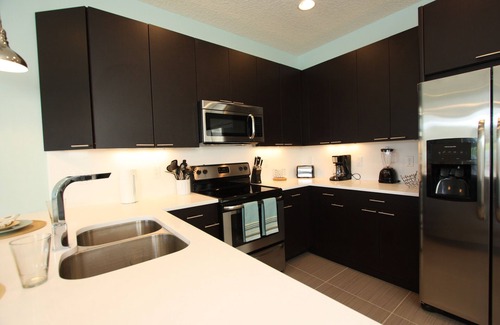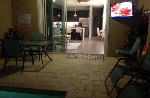 This Serenity Dream home is unlike anything else in the Disney area rental market. Located in a quiet setting, this is a very chic, European style home, and only 11 miles from Disney. Over $20,000 in upgrades from an already great design. This is the owners personal winter residence and is now available to you the rest of the year. You will delight in a home with Ceasarstone counters, Moen faucets, Simmons mattresses, and hardwood and tile floors (no dirty or worn carpet!), and 5 large HD TV's (50" to 65"!) with DVR throughout. Even the pool area has it's own set. What a perfect way to enjoy warm Florida evenings by floating in the splash pool and watching TV. Pool heat is $25/day if needed.