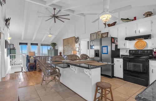 On either side of the living room, you’ll find two bedrooms sharing hall access with a full bathroom. Both oceanfront bedrooms are furnished with a queen bed, and the west side bedroom has direct access to the oceanfront porch. Each street-side bedroom has a double bed and a single bed. Three of the bedrooms have their own smart TVs with streaming capabilities. Interior stairs lead to the ground level laundry room and lower outside access.