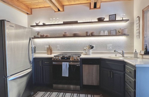 Walk in and step on the warm, new laminate wood floors that cover the entire main floor. The interior of this cabin is an exquisite blend of modern and natural beauty. The living room with stone fireplace is beautifully furnished and has plenty of bright natural light and spacious enough for six but intimate enough for two. The kitchen features a new 5-burner stovetop with oven, stylish painted cabinets with quartz counters and stainless steel appliances. It has LED lighted open shelves made from natural wood stained to match the beauty of the tongue and groove walls. The kitchen has a mounted hand-made table made by our family, that is big enough for six with a small footprint keeping the kitchen open. The full bathroom is well stocked with plush towels and a hair dryers. An accent wall is decorated with lively wall paper and a beautiful mirror to admire yourself. Lastly let’s not forget the laundry room/mud room with a washer and dryer.