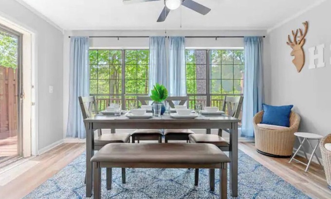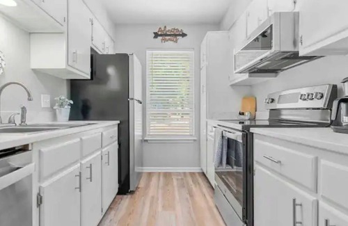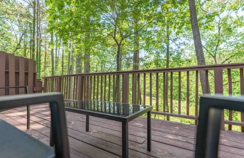 Blend tranquility and convenience in our 2 story townhome. Cozy living room with sectional sofa and 55” Roku Smart TV. Ceiling fans throughout. All LVP flooring (no carpet). Fully stocked kitchen with all new stainless steal appliances. Half bath downstairs. Pool table on main floor. Outdoor back deck to take in the natural forest setting and enjoy views of Lake Desoto Creek and golf course. Both bedrooms are located upstairs. Each bedroom with Roku 32”Smart TV's, black out curtains. Desk and chair in 1 of 2 bedrooms. Full bathroom upstairs with tub and shower combo.