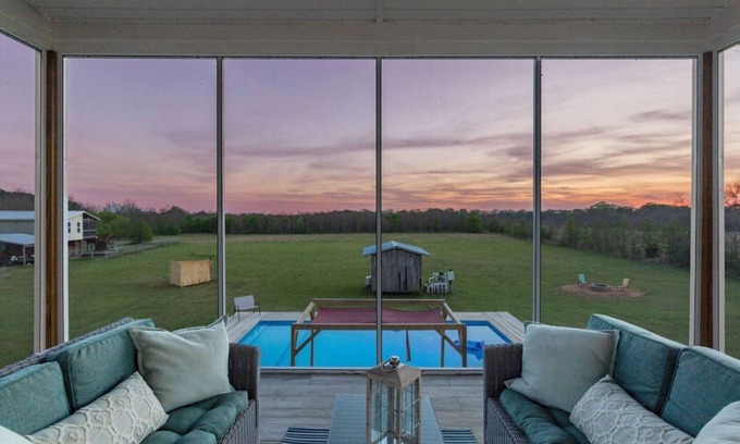 This spacious home has beautiful countryside and wide open space as it sits on a sprawling 5 acres. It is adjacent to the blueberry you-pick farm, which is perfect when you catch them in season. The detail and love that went into this property is evident. The main home is light and airy as you walk in, with floor-to-ceiling windows to watch the beautiful sunsets. It has a desirable open floor plan that is great for entertaining and spending time with friends and family. It has granite countertops, stainless steel appliances, a drawer microwave, a fully equipped kitchen for cooking, a smart TV for streaming, and a laundry room. The master bedroom has a queen-sized bed and the master bath has a double vanity, a huge tiled shower with double faucet heads, and a closet. The guest bedroom has a bunk bed with 1 full mattress,1 twin mattress, and 1 additional single twin bed. The guest bath has a tub/shower combo. There is a screened-in back porch, which is a personal favorite of mine. It overlooks the pool with room for sunbathing and a fire pit for roasting marshmallows. There is an outdoor cooking area with a charcoal grill and a picnic table. It is the perfect place just to get away and relax! Please don't hesitate to reach out with any questions or concerns! We want to ensure you have the best stay possible and ensure your privacy as well. We are here to help in any way!
