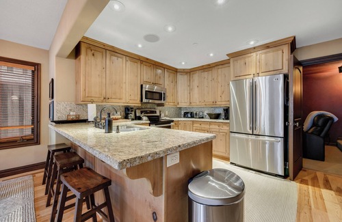 Upstairs (the 3rd level) you’ll find three bedrooms, a game room loft, and a laundry room. The large and luxurious master bedroom suite occupies all of the fourth level, has 18ft vaulted ceilings and a stunning floor to ceiling stone fireplace. There is a large covered patio with spectacular views of the ski runs and Main Street. The master bedroom has a 42” wall mounted plasma and in the ceiling speakers so you can enjoy listening to music as you warm yourself up by the magnificent fireplace. The master bathroom has beautiful faux finishes on the walls, an oversized soaking tub, and an all stone with tempered glass shower that has a rain head, along with a regular faucet and a state of the art steam system! By the way, the master bathroom also has ceiling mounted speakers that are on an independent switch from the master bedroom.