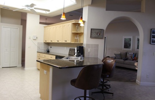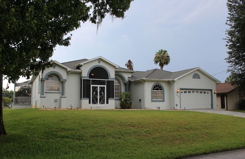 The home also has a beautiful, open kitchen which overlooks the main living room and the swimming pool, with views down the canal. The swimming pool and shaded lanai blend into the living room and also open into the master bedroom. The home come equipped with an alarm system to keep little ones safe from the pool. There is also a very large garage and sizeable driveway that should be able to accommodate most RVs or other large campers. There’s a large washer and dryer combo in the laundry room just off of the kitchen.