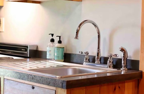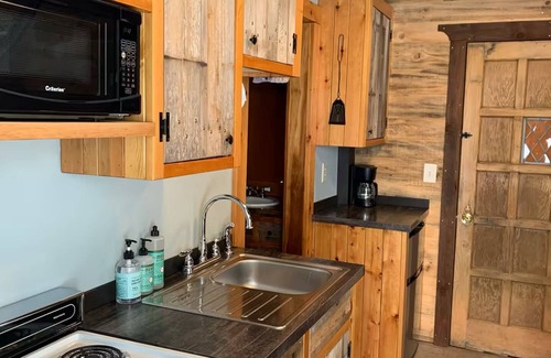 Fully Equipped Kitchen – Cook with ease using our vintage-style stove, microwave, coffee maker, and plenty of counter space—all framed with beautifully crafted reclaimed wood cabinets.