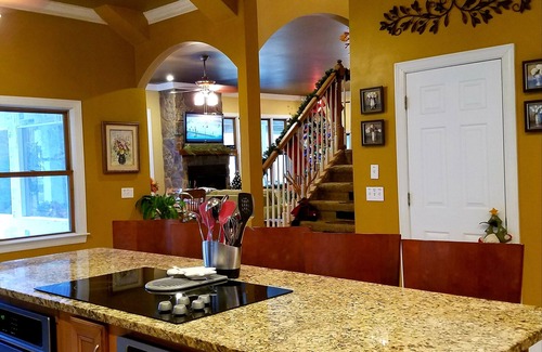 Just wanting to kick back and relax? You can do that in the large family room located on the main level where you can enjoy the stone fireplace, flat screen cable TV, grab yourself a refreshing beverage from the wet bar or maybe a snack from the well-equipped kitchen, featuring all stainless steel appliances, double ovens and beautiful granite counter tops and all the kitchen utensils you will need to make cooking a meal for large groups a breeze, table seating for 16 and bar top seating for 10 with additional seating available, the main floor is also where you will find 1 of the 2 master suites with a large master bathroom that has a deep soak tub and a walk-in shower, the laundry room, and a 1/2 bath are also located on the main floor.