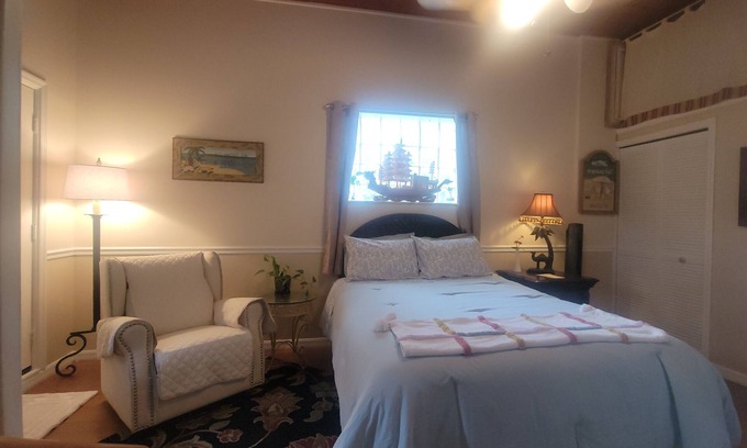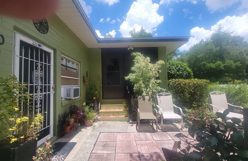 Fall in love with this Private Garden Efficiency. Just 1 mile from Downtown Ocala. Yet tucked away in this charming historic neighborhood with towering oaks & tree lined sidewalks. Private entrance to the Garden Efficiency that is all yours. It is attached to my home by 1 wall. Enjoy the small kitchenette with Quirig coffee, tea, water & snacks provide. As well as a large mini fridge with seperate freezer, microwave & toaster. Relax just outside your door on the bricked garden patio with chairs & a lounger. Guests are also welcome to enjoy the screened patio with comfy overstuffed rockers. Silver Springs is less than 10 minutes up the road. The World Equestrian Center is 25 minutes away. Downtown Ocala is a mile away, offering resteraunts, shopping, events, nightlife & 2 hospitals. This unit is perfect for 1 or 2 people . The washer & dryer is available to guests staying 3+ nights.