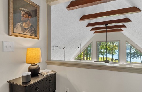 The Fish Camp sleeps up to 12 comfortably with a total of 4 bedrooms and 4.5 bathrooms – with multiple renovations, new fixtures & hardware, updated lighting, and fresh interior paint. The main A-frame cabin (Bluecat Cabin) provides a large main-floor primary suite with King bed + full bath (with smart TV), second-floor primary bedroom with King bed + full bath, powder room for your convenience, great room with towering, vaulted ceilings and full entertainment setup, kitchen that is super well-stocked with custom cabinets and granite countertops, and massive + unimpeded windows throughout for stunning, big-water lake views from the entire house. Adjacent to and just steps away from the main cabin, you'll find the cottage (Shellcracker Cottage), which is absolutely perfect for those additional guests that might need a more private and quiet setting. This space exudes a very vintage charm about it and like the main house, has all the amenities one might want - including 2 Queen beds with wood-paneled headboards, kitchenette area (with sink, mini refrigerator, coffee maker, microwave, & accessories), full bath, and comfy lounging/sitting area with a smart TV + desk setup. Guests can also enjoy the loft above the garage (Largemouth Loft), which has some additional fun entertainment features such as a Lounge & Co Crash Foam Pillow and Roku 4K Streambar; this area includes two full-size daybeds, kitchenette area (mini refrigerator, coffee maker, microwave, & accessories), full bath, and another spacious lounging/sitting area with a smart TV + desk setup.