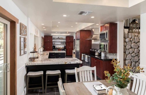This 6,000 square foot Big Bear Estate is truly impressive. With seven bedrooms and 5.5 bathrooms, it's perfectly suited for accommodating a large group or a family. The cabin-style living with a designer's touch and modern amenities, including a well-equipped kitchen, spacious game room for indoor entertainment, offering a pool table, air hockey table, ping pong table, arcade video games,75" smart tv and gym.