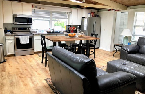 The house features two wings that share a large common area in between. This allows large families or multiple families to vacation together yet still have their own space. A substantial butcher block table counter provides seating for up to 10 and multiple tables and chairs are available on the screened porch, large deck and patio.