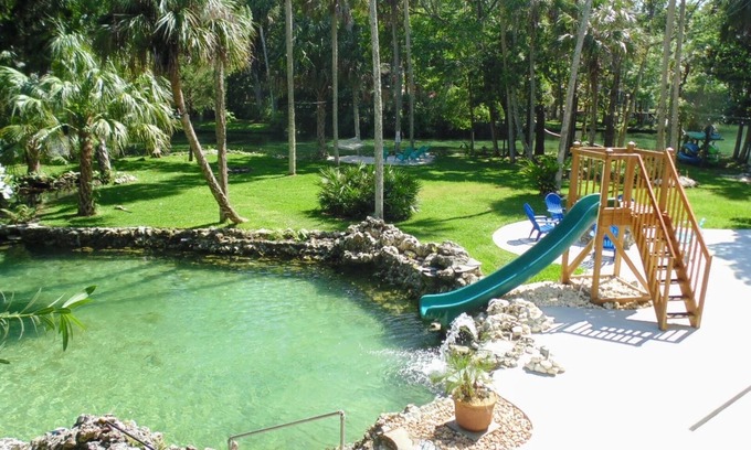 Situated near the headwaters of the Homosassa River, the property features over 200 feet of riverfront on nearly an acre of land, a private lagoon and a water slide for young and old alike.