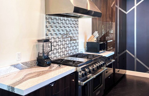 A fully equipped kitchen with granite countertops and premium appliances, including a Wolf stove-oven with air fryer, Sub-Zero refrigerator, wine fridge, and an in-wall wine cellar.